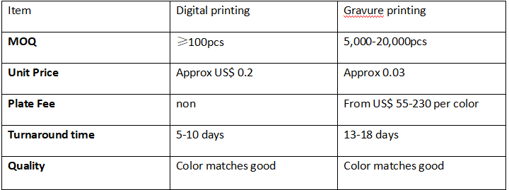 Let's assume the customer wants 10,000pcs bags with 4 colors printed, then digital printing need cost US$ 2000, Gravure printing need cost US$ 620. So the digital